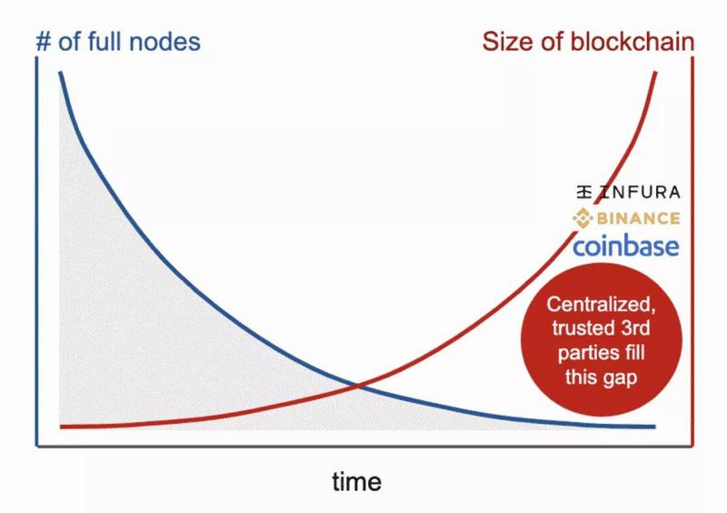 PoW 鏈需要全節點同步所有區塊以驗證整個鏈的合法性。隨著時間的推移,一條鏈上的區塊會越來越多,鏈的數據規模會越來越大,需要占用更多的資源來維持整個鏈。這通常被稱為狀態通脹(state bloat)。因此,這一定程度上限制了全節點的數量,還降低了去中心化程度和訪問性能。
