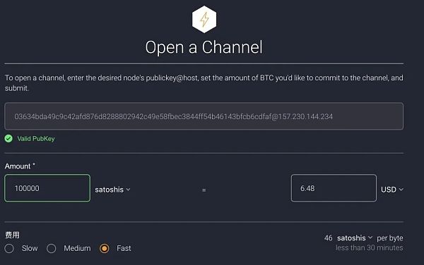 在創建 Channel 頁面,可以看到節點的 Publickkey 以及選擇放入通道的資金。同時可以選擇通道的費率,分為慢中快 Slow、Medium、Fast 三檔,費率分別為 1 satoshis per byte、4 satoshis per byte、46 satoshis per byte,其高低與用戶放入 Channel 的資金大小沒有關系,由節點服務商確定費率。