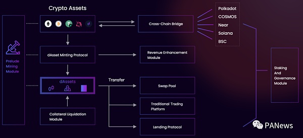 根據Duet Protocol白皮書所述,dAsset的抵押品可以是生息資產(如aToken、yToken、LPs)、原生加密資產(如BTC、ETH、SNX)、跨鏈PoS資產(如bLuna)。Duet增加了更多的優質資產(BTC、ETH、USDT)作為抵押品,包括DeFi世界獨有的資產(cToken、aToken、LP代幣),以達到更廣泛的基礎資產規模。Duet還接受競爭對手的代幣作為鑄造dAsset的抵押品,優化DeFi的可組合性。yToken或者跨鏈生成的PoS代幣之類的生息資產,也可以為Duet的用戶提供更可觀的回報,用戶的抵押品將被發送到相應的收益抵押合約中賺取利息。