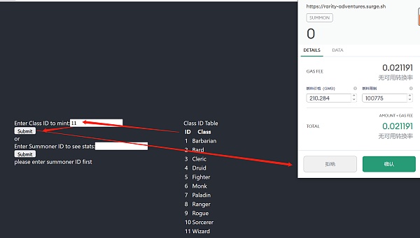 目前各職業的屬性暫不清楚,可以根據喜好選一個職業,輸入到Class ID框內,點擊[Submit]進行MINT,按提示確認交易即可。