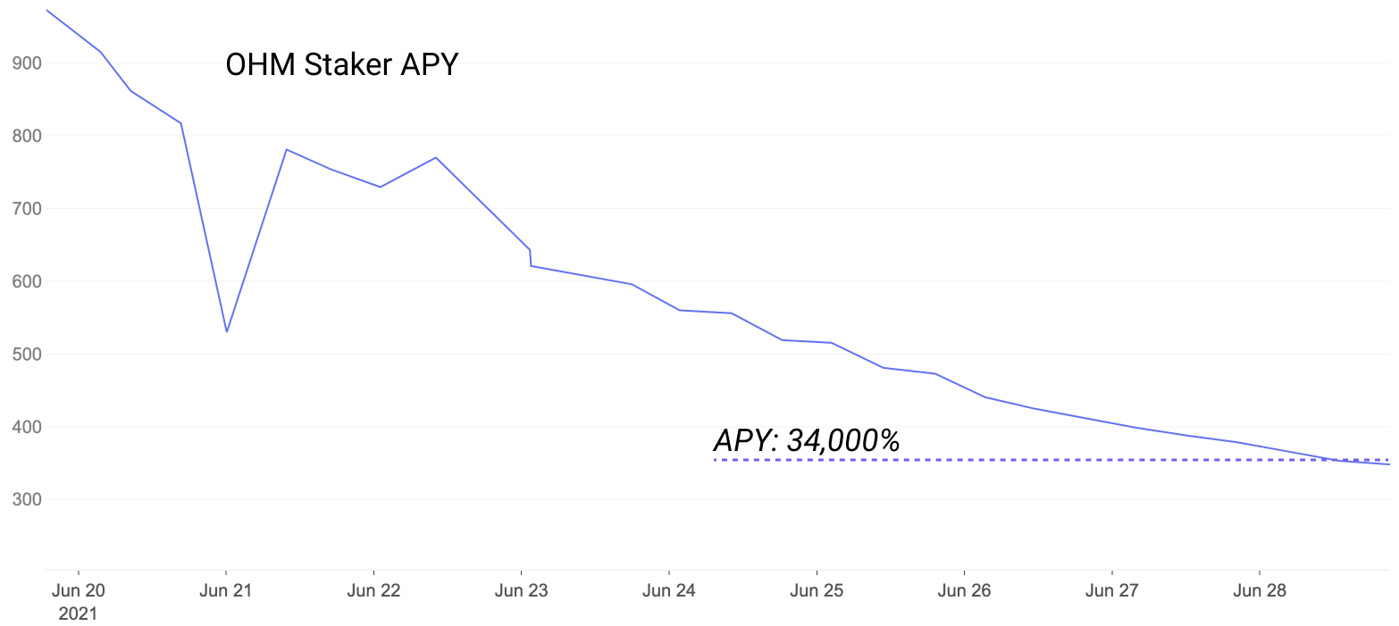但這種資產的純美元價值遠遠不能說明問題的全部。目前在發行模式下,OHM的通貨膨脹已經足夠高,以至于以美元計算購買絕對高點的OHM買家也能獲利。自4月份推出以來,staking OHM的APY平均已超過100000%。OHM staker的年度回報率目前約為34000%,低于本周初的40000%和6月初及之前幾個月的100000%。