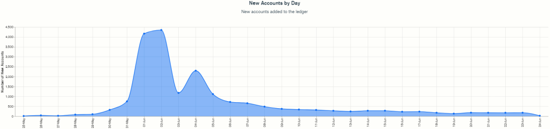 可以看到,在6月初新賬戶增加量較大,這也反應在日交易量上。可能原因是在6月1日,CoinList上線了MINA的交易與質押,用戶可直接在CoinList上質押MINA,賺取收益。常規的每日賬號增加數基本在500之下,表現一般。