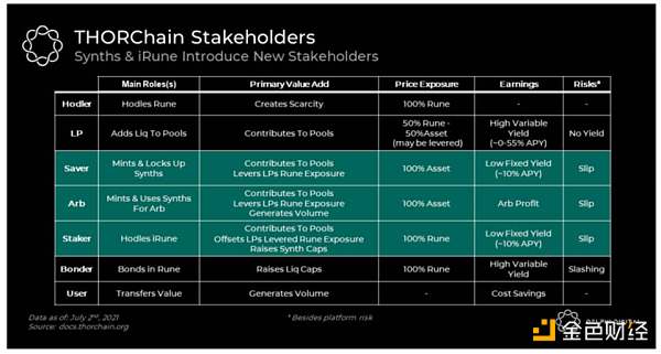 Synth 和 iRune 設計機制將引入新的質押者,他們扮演的角色、承擔的風險和產生的收益各不相同。我們在下表中進行了總結: