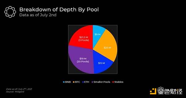 目前,THORChain 的總流動性約為 1.4 億美元,分布在 26 個資金池中。我們評估了其中 5 個類別下所有資金池的 APY; 即 BTC、ETH、BNB、穩定幣(BUSD、USDT 和 USDC),以及每個持有少于 250 萬美元資產的小型資金池。由于缺乏足夠的歷史數據,xRUNE 資金池未包含在分類中。