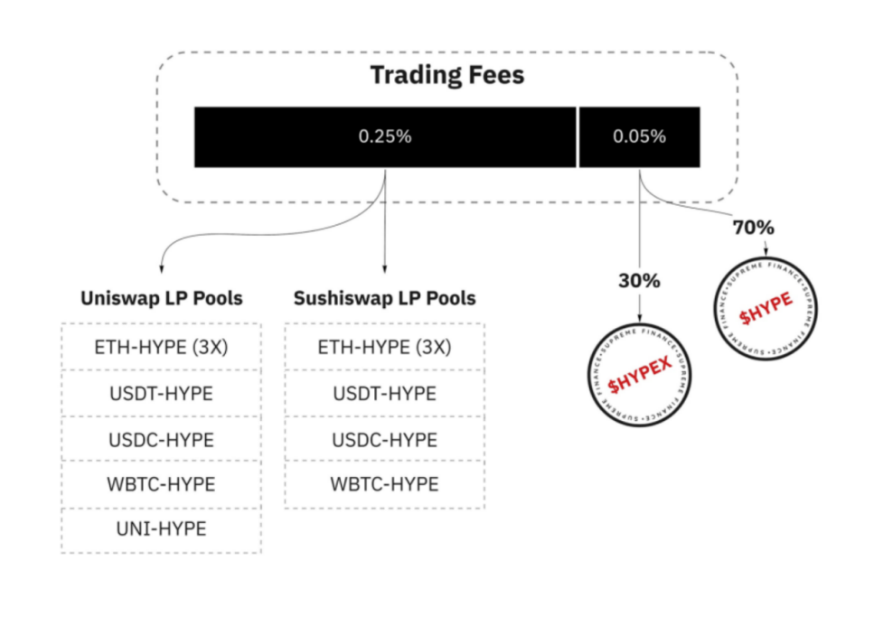 為了公平分配和激勵早期的LP和支持者,SUPREME?Finance將HYPEX與HYPE進行1:1互換(HYPEX只能通過參與初始公平分配來獲得)。HYPEX將在Boosting設置的一段時間之間可用,并且僅與HYPE互換,后續則可以通過SUPREME?Farm的Swap Service獲得HYPEX,匯率將取決于HYPE的回報率和流動性池中LP的參與率。