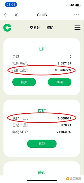 5 在CLUB的Dapp頁面,可以看到增加流動性后得到的lp的數量,點擊挖礦,依次操作授權、抵押所有的LP,隨后就可以看到自己的挖礦占比,另外產出的數量也開始慢慢增長。
