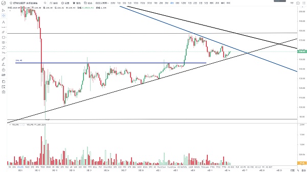 今日同樣弱勢反彈,量能一般,走出像前期獨立行情的可能性不大,當然直接大幅下殺的概率也不大,目前價格仍處于前期上升三角上沿支撐區域,這個位置后面一旦放量跌破收不回去的話,后面迎來大幅下殺的概率將會大大增強,減半后目前屬于聯動走勢,近期關注184美金的支撐情況。