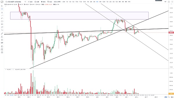 前期大跌,今日超跌反彈,和其余主流幣一樣,反彈無力,量能一般,反彈高點也沒過前期關鍵周線支撐區域,整體趨勢依舊空頭占優,目前技術上4小時運行在一個下降通道內,目前位置接近上沿壓制區域,當前量能突破概率不大,短線遇阻再次回落的概率大,注意風險,短期支撐前低39.5美金,放量破掉就要繼續下尋支撐,較強支撐在37附近。