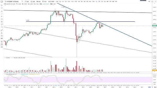 技術圖形上,能明顯看到今日反彈,依舊受阻于前期頂點回落的下降線壓制,這個量能想突破的概率不大,近期仍屬于聯動行情,下方較強支撐為3.46美金,這個位置是前期日線階段V形底頸線位,也是30日線支撐區域,構筑雙重支撐,后面回落附近可低吸,今日趨勢壓制3.87美金,操作上再未強勢突破前,建議觀望。