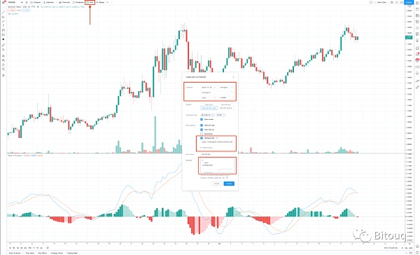 在“條件”選項欄選擇交易指標。以MACD為例,交易策略是當直方圖從負變為正的時候,做多標的資產