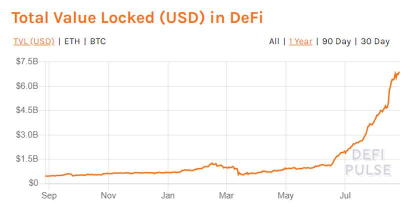 DeFi 近幾個月的爆發在數據上清晰可見,根據 DEFI PLUSE 網站數據,截止撰文時 DeFi 的總鎖定價值(TVL)為 81 億美元,而該數據在六月初僅為 10 億美元左右,也就說 TVL 在不到三個月里增長了將近 8 倍。并且仍呈現有增無減之勢。