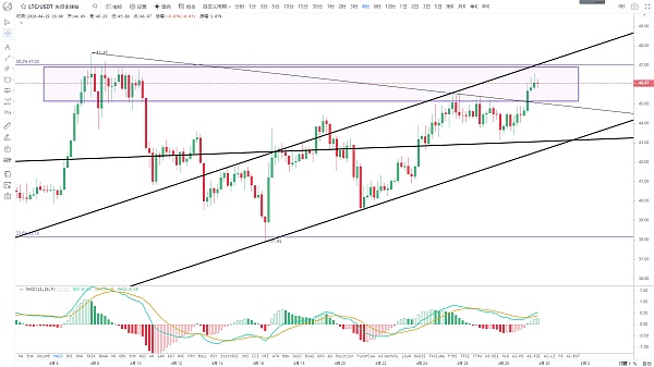 LTC今日反彈相對強勢,突破前高47.65回落的下降線壓制,最高漲至46.59再小幅度回落,目前技術圖形上,價格已進入前期反彈頂部區間箱體,4小時也有背離趨勢的,并接連出現上插針形態,意味著上方的阻力還是較強,一次性突破前高的難度較大,調整蓄勢后再上攻的概率大,短線可沿5日線持幣,回落低吸為主,壓力47.65,支撐44.5美金。