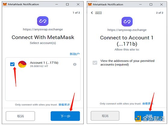 在彈出窗口,選擇“MetaMask”。選擇要連接的賬號,點擊“下一步”按鈕。確認是要連接的賬戶,點擊“連接”按鈕。若在右上角顯示賬戶的地址,則表示連接成功。