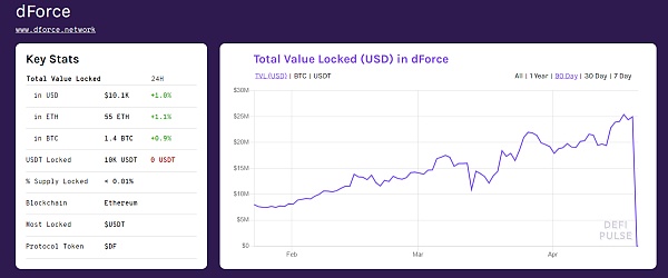 被攻擊后,Lendf 鎖倉資產美元價值瞬間下跌 100% 至 6 美元,而此前的鎖倉總價值超過 2490 萬美元。