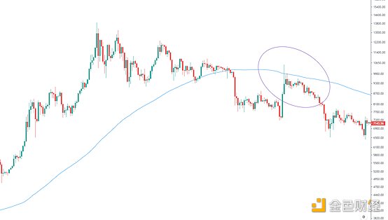 2017年牛市結束,BTC見頂20000美金開始回落,同樣在跌破120日均線支撐后迎來加速下探,后面也是出現了大反彈向上回抽120日均線的過程,不過一樣未能站穩,觸碰后價格繼續回落再創新低,所以也是個熊市里的超跌反彈,不是行情反轉。