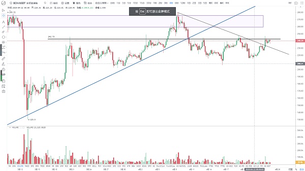 跟隨反彈,不過量能未能有效放大,目前上方短期壓制60日均線,不過短期仍屬強勢走勢,震蕩消磨后站上的概率大,4小時走勢也能看出突破了近期下降線,近期也有構筑一個雙底的形態,一旦放量突破頸線壓制,那么繼續向上沖擊260上方的壓力將是大概率,支撐232,壓力247.