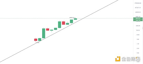看下BTC2011-2021年長期年線走勢,整體沿趨勢線一路向上,說明只要長期持有,目前都是牛市。