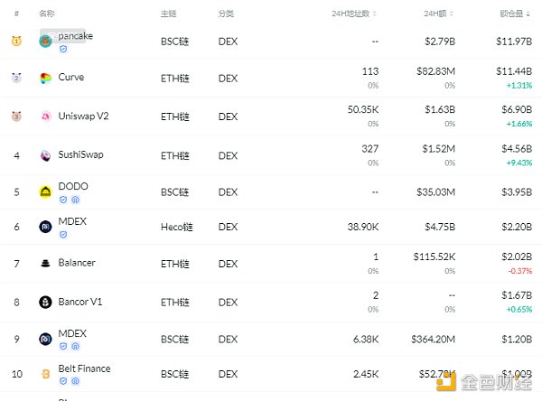 交易量排名前十的DEX 排名來源:DeFibox