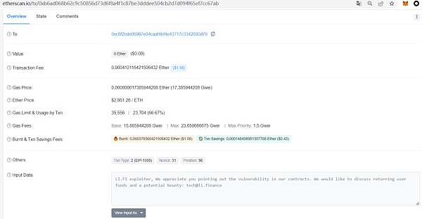 北京時間3月20日晚,知道創宇區塊鏈安全實驗室?監測到以太坊上分布式跨鏈協議。Li.Finance 受到了攻擊,攻擊者執行了 37 次call注入,獲取了多個錢包中約 60 萬美元的資產(204個ETH)。此次資產損失并沒有非常大,但項目方對于攻擊的處理非常積極并值得學習與肯定(見后文),目前項目方已補償了協議損失并修復后重新部署了協議。