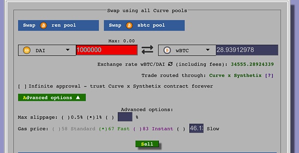 用 Curve 交易,得到大約 28.94 個 wBTC 。就是說,同樣的交易,通過 Curve X Synthetix 的交易功能,多得了 0.7 個 wBTC?。