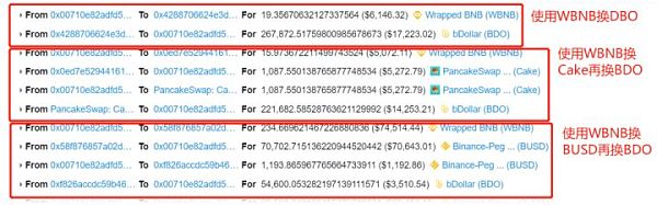 而最為關鍵的是,攻擊者實施攻擊前,在 WBNB/BDO、Cake/BDO、BUSD/BDO 池子中換取了大量 BDO 代幣導致 BDO 價格被抬高。