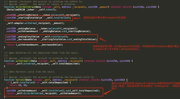 通過代碼分析不難發現,vault 庫合約的 harvest 函數其實是檢查了外部的 adapter 的總的資金量,然后根據 adapter 中的資金量減去用戶的充值數量計算出收益的部分。