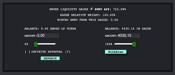 訪問swUSD的穩定幣兌換池,抵押DAI、USDT、USDC、TUSD任一幣種:http://ipfs2.swerve.fi/#/swusd/deposit