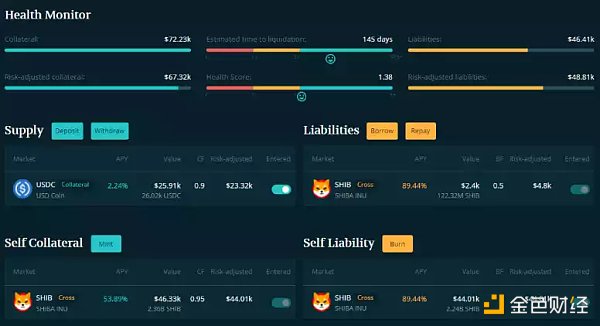 為了讓用戶直觀掌握借貸動態,Euler 在用戶界面上提供了詳細的抵押資產和借出資產的市場價值以及風險調整后的價值,還顯示了賬戶的健康狀況和預期要過多久才會被清倉。這些信息將幫助用戶更有把握的操作。