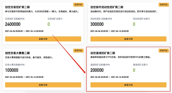 2021年4月6日20點 -2021年4月16日20點,即為YFX創世挖礦第二階段,將有3,000,000個YFX 通過“交易挖礦、流動性挖礦、交易大賽、邀請挖礦”的方式分配給YFX社區。第二階段共持續10天,在ETH(xDai layer2)、Tron、BSC、Heco同時開啟挖礦活動。