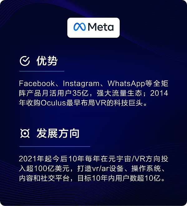目前VR市場上Meta的Oculus一家獨大,Oculus全系列產品市占率超70%。值得一提的是,Meta在元宇宙的布局,已不僅僅是設備。從近幾年的動作看,Meta主要圍繞硬件和應用兩個方向發力,具備社交娛樂屬性。