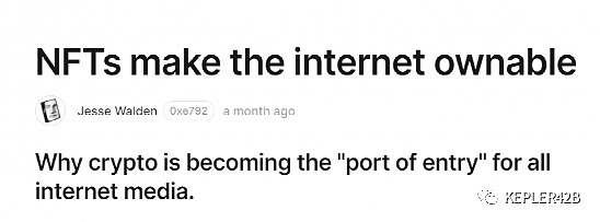NFT讓互聯網成為可以擁有的,詳見https://variant.mirror.xyz/T8kdtZRIgy_srXB5B06L8vBqFHYlEBcv6ae2zR6Y_eo