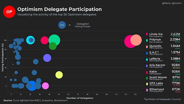 Linda Xie 和 Quixotic(DAO 最大的兩個代表)代表了如此龐大的委托群體,這也是去中心化中一個令人鼓舞的信號。展望未來,我們希望未參與的頂級代表能有更多的參與。隨著報道的一致性和可見性的提高,我們希望看到更小、更積極的代表能從冷漠的代表中吸收一些投票權。