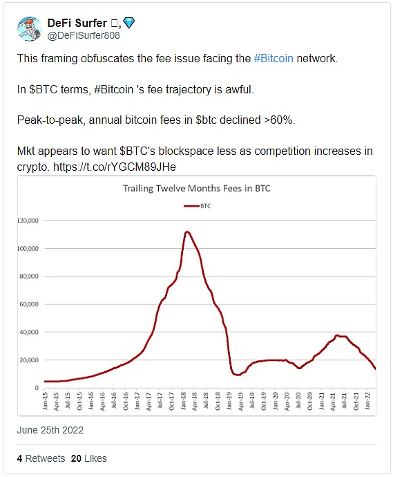 價值存儲的用例與大量的活動不一致,因此費用也不一致。從一個周期到另一個周期,比特幣網絡產生的費用以比特幣計算下降了60%以上: