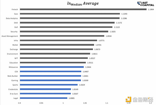 由上圖可見,從CV1.5以下低離散度的角度來說,beta市場可以大致定為Wallet、Gaming、Web Builder、Sports、Education、Environment、X-to-earn、Credentials和Legal。但是因為一個季度的數據量會對CV的可信度造成影響,這里用AVE-MEDIAN做cross verification,如下。