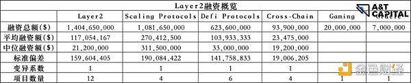 總體數量太少,不具有統計意義。總體來說,Layer 1 & Layer 2屬于融資額度高,賽道火熱。按照技術流分項目的話,融資額度相差不大。