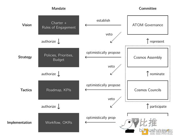 這里提及了 Cosmos 集會(The Cosmos Assembly)這個概念,是一個代表 Hub 社區利益的組織機構。它由 ATOM 持有者定義總體章程,DAO 可以成為理事會,并會被添加到章程中,為特定主題提供資源和授權,Cosmos 集會則由理事會的代表組成。