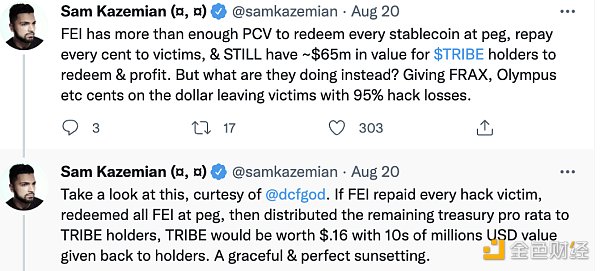 Frax創始人Sam Kazemian則是當前方案的主要反對者。Kazemian首先質疑5月份的snapshot投票沒有得到有效執行,隨后市場遭遇暴跌。Kazemian的主要觀點在于,即使賠付了所有人的損失,Fei Protocol仍然剩余有數千萬資金可以分配給TRIBE的持有者。按照現行標準,Frax的損失僅賠付2%,Olympus DAO的損失賠付3%,Balancer的損失賠付19%,Vesper的損失賠付27%。