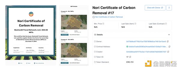 NORI 代幣將像 BTC 和 ETH 一樣可以在加密貨幣交易所交易,訂單匹配引擎實時配對買家和賣家,為碳清除創造一個動態價格。每個 NORI 代幣可以兌換一個 Nori 碳清除量,即 NRT。為了提高透明度,NRT 作為 NFT 在 Polygon 鏈上被鑄造,并附有一份獨特的證書,證明買方的所有權與他們的碳清除量退役日期。NORI 代幣與 NRT 分開交易,但鑒于 1-1 贖回機制,仍然反映了市場對它們的實時需求。當贖回 NRT 時,NORI 代幣被支付給碳清除供應商,這確保他們能夠參與任何市場范圍的價格上漲。