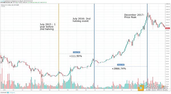 當時,我們只有兩次比特幣減半的數據點。考慮到樣本量很小,因此這是一個大膽的說法。但是現在,我們可以填寫比特幣第三次減半的數據。