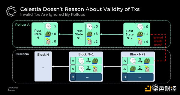 交易的驗證和執行交給基于 Celestia DA 的 Rollup。對于無效交易,Rollup 會忽略它們,Celestia 不會去「處置」這些無效交易。