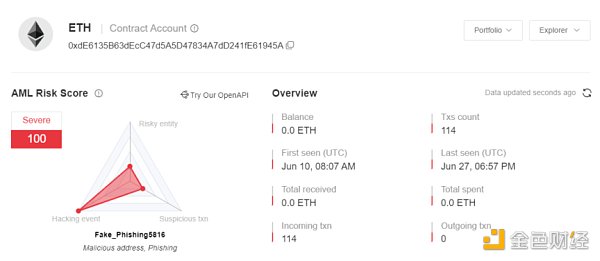 先分析騙子合約地址(0xde6...45a),可以看到這個合約地址已被 MistTrack 標記為高風險釣魚地址。