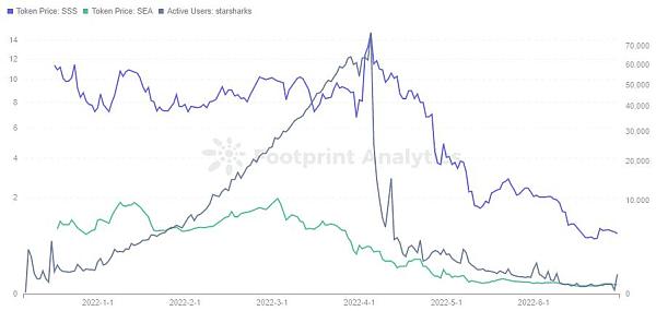 不幸運的是正好趕上 GameFi 寒冬期,用戶打金欲望極度下降。因此 StarSharks 在前期玩家數量也不算太高,在當時也被人戲稱它是 “開盤即巔峰”。