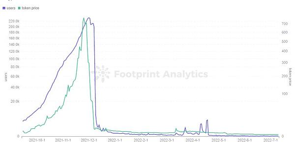 Axie Infinity 作為 Play-to-earn 的鼻祖,其背景、資源、玩家共識都是當期的其他鏈游無法匹敵的。因此它在僅有基礎雙幣模型和繁殖系統的情況下,依然能保持幾個月的上升期,在之后也是緩慢下跌,至今仍有一部分忠實用戶。