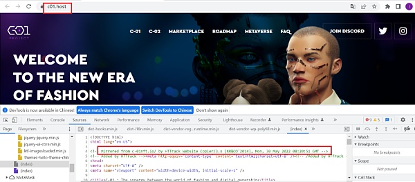查看源代碼,發現這個釣魚網站直接使用 HTTrack 工具克隆 c-01nft.io 站點(真實網站)。對比兩個站點的代碼,發現了釣魚網站多了以下內容: