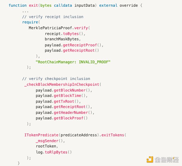 下面是該函數的核心邏輯,主要包括三部分:第一部分是校驗 withdraw 交易收據的有效性,第二部分是校驗檢查點是否包含了交易區塊,第三部分是調用 predicate 合約中的 exitTokens() 函數將鎖定的代幣發送給用戶。