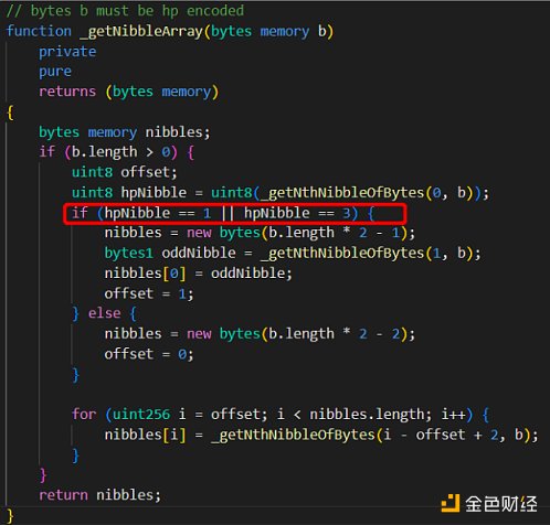 3、跟蹤交易驗證邏輯中的調用的 MerklePatriciaProof.verify() 函數,發現該函數調用_getNibbleArray() 對 branchMaskBytes 進行了轉碼操作: