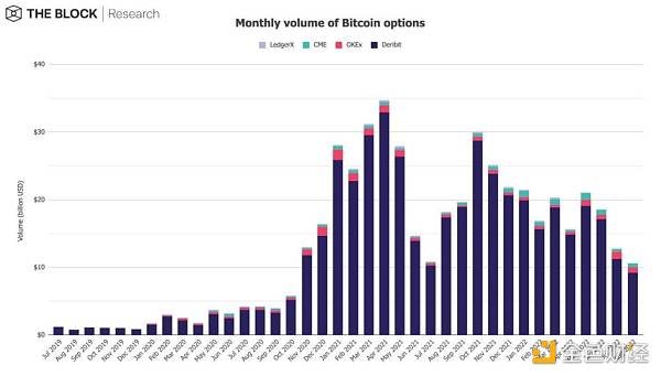 12- 期權方面,比特幣與以太坊未平倉頭寸總體上是增加的,其中比特幣未平倉頭寸減少了 11%,而以太坊增加了 16.7%。交易量上同樣也是比特幣期權交易量減少,以太坊增加。比特幣期權月度交易量下降 16.5% 至 106 億美元,再創 2021 年 8 月以來新低,而以太坊則上升 6.1% 至 121 億美元。