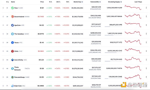 NFT總市值、市值排名前十項目 數據來源:Coinmarketcap