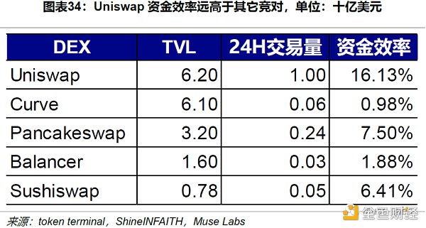 從 TVL 及日交易量,我們可以推斷出 DEX 的資金效率。經過測算,Uniswap 的資金效率約為 16.13%,大幅高于其它 DEX,也在一定程度上反映了 Uniswap V3 集中流動性機制的有效性。更高的資金效率意味著 LP 提供的流動性被利用的概率更高,提升了其做市意愿。