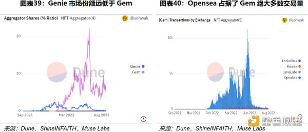 在 Uniswap 收購 Genie 之前,NFT 交易平臺龍頭 Opensea 為防止 NFT 市場聚合器搶占市場份額,直接防御性收購了其賽道龍頭 Gem,兩者在各自賽道內本就具有極大的先發優勢,如今更是強強聯合。雖然 Genie 在賽道內僅次于 Gem,但仍與其差距明顯。